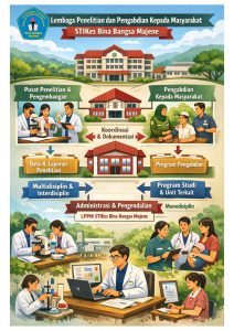 Lembaga Penelitian dan Pengabdian Kepada Masyarakat (LPPM) STIKes Bina Bangsa Majene adalah unsur pelaksana akademik yang melaksanakan sebagian tugas pokok dan fungsi STIKes Bina Bangsa Majene di bidang Penelitian dan Pengabdian Kepada Masyarakat. LPPM STIKes Bina Bangsa Majene mempunyai tugas melakukan koordinasi dan mendokumentasi pelaksanaan kegiatan penelitian dan pengabdian kepada masyarakat serta ikut mengusahakan pengendalian administrasi sumber daya yang diperlukan. Untuk melaksanakan tugasnya, kegiatan – kegiatan penelitian dan pengabdian kepada masyarakat yang bersifat multidisiplin dan interdisiplin dilakukan oleh pusat-pusat penelitian dan pengembangan di lingkungan LPPM STIKes Bina Bangsa Majene sedangkan kegiatan-kegiatan penelitian yang bersifat monodisiplin dilakukan oleh program studi dan unit lain di lingkungan STIKES Bina Bangsa Majene, dengan prosedur administrasi dan saluran tetap melalui LPPM STIKES Bina Bangsa Majene
